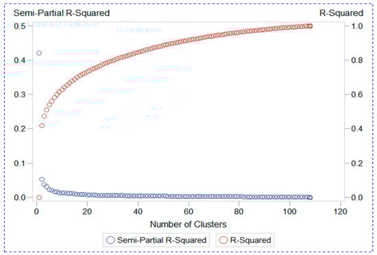 A statistically significant number of clusters can be assessed heuristically on the basis of a subjective opinion of the solver, who chooses a logical and interpretable solution. Another possibility is represented by means of the characteristics determining the quality of the clustering at each level. These are the semi-partial coefficient of determination (SPRSQ) and the coefficient of determination (RSQ). These coefficients are shown in the scatter plot (Figure 1). A significant break occurred in the ninth cluster, and therefore the analysis is limited to nine statistically significant clusters. Other values of the coefficients do not differ significantly and decrease or increase slowly.