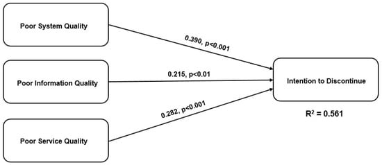 The main effect model was examined first. Figure 2 shows the results for the conceptual model’s main effects, showing the standardized path coefficients (β) among the constructs, p-values, and the variance explained (R2). The R2 value for discontinuance intention was 0.561, explaining 56.1 per cent of the variance, and the path coefficients of H1, H2, and H3 were statistically significant (Table 5). Thus, the findings supported H1, H2, and H3. System quality, information quality, and service quality have significant and positive effects on discontinuance intention. All the path coefficients and explained variances for the model are shown in Figure 2. Further, gender characteristic collected about the sample respondents was tested as possible control variable by assessing its path coefficients to the endogenous variables of the model. No changes in the measurement model were noticed.