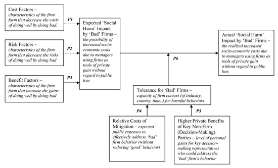 Having met the two standard requirements for arguing a new TotF, we can now consider the main implications. Our new TotF describes the use of the firm form as a tool for doing well by doing bad, so it is important to understand the conditions under which the activities of such ‘bad’ firms are most likely to result in social harms. It is important because once those have been identified, there exists a greater possibility of mitigating such harms. The main conditions necessarily include not only the incentives for using the firm in this way but also the tolerance of that use in the firm’s context. We know this because research has shown that the firm’s ‘tolerance context’—in terms of the incentives, rules and expectations, and their interactions—influence managerial behaviors (e.g., in tournament theory studies—see Kini and Williams 2012). Thus, our propositions will focus on the expected net rewards from ‘doing bad’, on the societal acceptance of such behaviors, and on their interactions, all in consideration of the realization of social harms. Figure 1 depicts the propositions and their connections.s