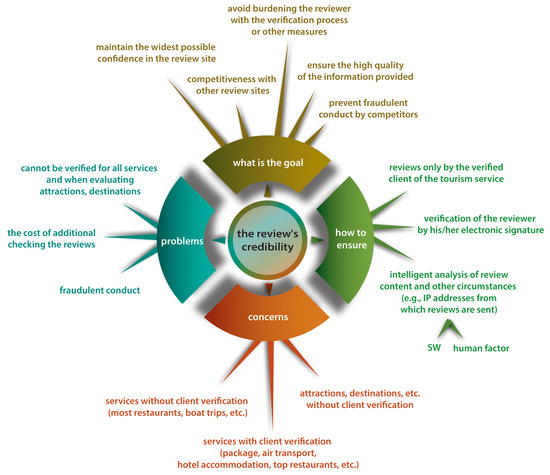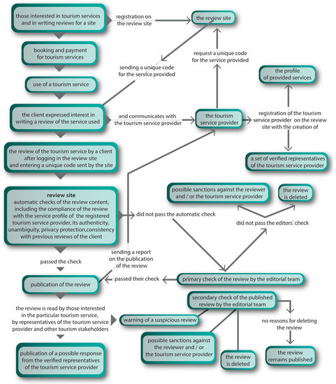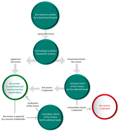 Figure 1 reflects the current situation, when the verification of the reviewer may relate to some tourism services. It also indicates possible and so far, rarely used solutions. Namely, the reviewer’s credibility is established by his or her electronic signature, which is attached to the review. Thus, the reviewer declares and assumes personal responsibility (including possible legal responsibility) for the content and emotional colouring of the review.