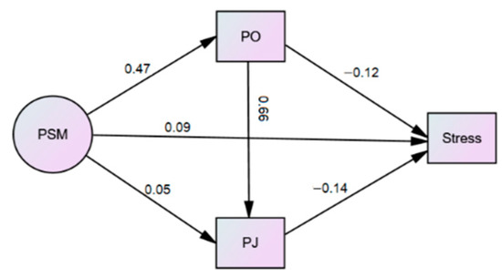 Considering the association that PO fit and PJ fit may have to work stress, how are these concepts related to PSM? Does PO fit and/or PJ fit mediate the relationship between PSM and work stress? There is a body of research that can help address these questions. Empirical evidence suggests that PSM is positively related to PO fit (Bright 2007, 2008; Giauque et al. 2015; Gould-Williams et al. 2015; Jin et al. 2018; Kim 2012; Teo et al. 2016) and PJ fit (Bright 2013; Quratulain and Khan 2015) in public organizations. Public employees with high levels of PSM are significantly more likely to express high levels of fit to the goals of their organizations and the demands of their jobs. Even more, existing research suggest that the relationship PSM has to work stress is partially mediated by PO fit. According to Gould-Williams et al. (2015), even though PSM had a direct positive association with work stress, it also maintained an indirect relationship through PO fit. That is, public employees with high levels of PSM were significantly more likely to have high levels of fit with their organizations, which in turn was negatively related to work stress. While there is no research that was found that explored this issue from the standpoint of PJ fit, a similar outcome is expected. High levels of PJ fit will also mediate the influence that PSM has on work stress.