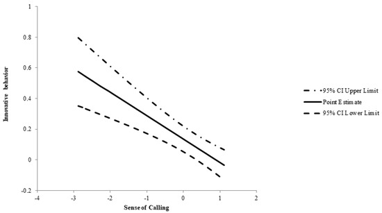 The conditional effect of servant leadership according to vocational calling was significant in vocational calling values from M−1SD (−1.049) to M (0.000) and not in M+1SD (1.049). If vocational calling was high, the effect of self-efficacy on innovative behaviour was not significant (Table 6).