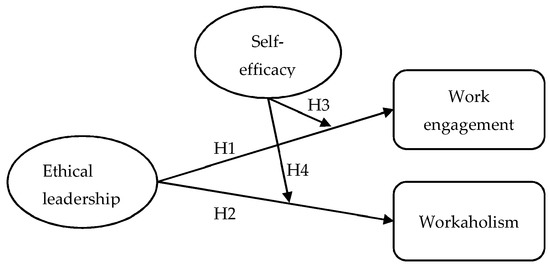 We aim to further investigate the potential moderation effect of self-efficacy on ethical leadership’s respective relationships with work engagement and workaholism, both categorized as heavy work investment, as personal resources affect individuals’ ability to control their environment. When individuals have more control over their working environment, we expect that it will affect their attitude toward daily working life; that is, they will either engage in their work or become workaholics, as both concepts are internally driven. Other studies argued that self-efficacy influences the improvement of individuals’ perceptions of work in the social context, which is closely related to engagement at the workplace (Consiglio et al. 2016; Zuo et al. 2021). The positive effect of ethical leadership on work engagement might be stronger when individuals have higher self-efficacy because self-efficacy acts as a self-motivation mechanism. We expect that when ethical leaders give their followers adequate motivational power and inspiration, employees are more engaged, and rates of workaholism are lower; we also believe this applies to both those with high self-efficacy and those with low self-efficacy. As self-efficacy is defined as “beliefs in one’s capabilities to organize and execute the course of action required to produce given attainments” (Bandura 1997, p. 3), ethical leaders should support their followers by providing them with an example of how to behave, especially in terms of ethical behavior. Therefore, we expect that self-efficacy might strengthen or weaken ethical leadership’s effect on both work engagement and workaholism. Hence, we hypothesize the following: