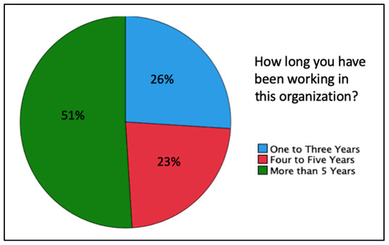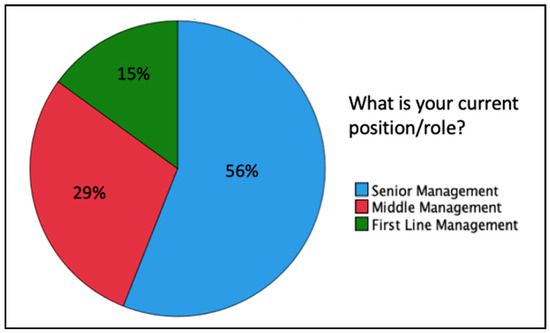 There were 100 respondents who participated in this pilot study. Their split in terms of their position/role and how long they have been working in the organization can be seen in Figure 1. Based on this pie chart, 56 respondents (56 percent) were part of senior management, 29 respondents (29 percent) were part of middle management, and 15 respondents (15 percent) were part of first line management. Majority of the respondents had senior management profiles, which supports the research aims of this paper.