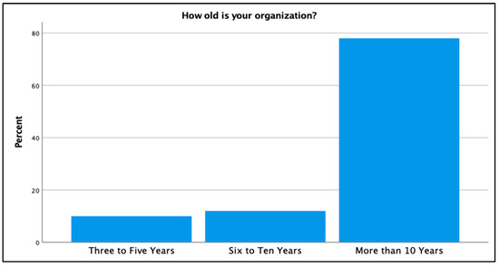 Next, referring to Figure 4, 78 companies (78 percent) are over 10 years old, 12 companies (12 percent) are six to ten years old, and 10 companies (10 percent) are three to five years old. Thereby, most of the organizations are established, with existence of more than 10 years.