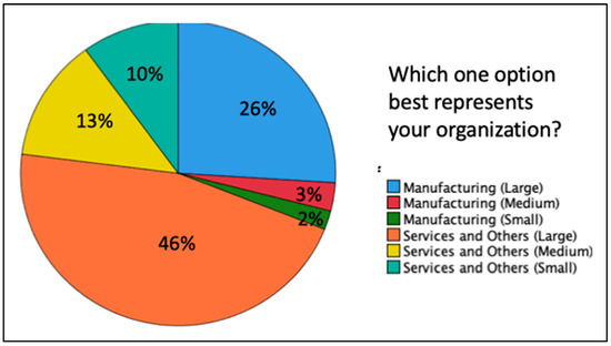 Finally, referring to Figure 6, within the service sector, 46 companies (46 percent) are large in size, 13 companies (13 percent) are medium in size, and 10 companies (10 percent) are small in size. Similarly, within the manufacturing sector, 26 companies (26 percent) are large in size, 3 companies (3 percent) are medium in size, and 2 companies (2 percent) are small in size. Here again, it confirms that majority of the organizations are services large and manufacturing large.