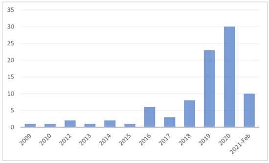 We identified 88 empirical studies on KH conducted in more than 30 countries. Relative to the rest of the world, more studies have been conducted in China (44.3%), Pakistan (15.9%), and the US (6.8%). Studies have been undertaken in fields where knowledge creation is crucial, such as information technology, pharmaceuticals, institutional research, research and development, sales, nursing, and university teaching and learning. Out of the 88 studies, seven (8.0%) incorporated an experimental study design for causal inferences (Zhao et al. 2019; Zhu et al. 2019). Many of the quantitative studies used either multi wave time-lagged surveys (39.8%), multiple-source surveys (3.4%), or both (9.1%) to reduce common method bias (Belschak et al. 2018; Cerne et al. 2017; Rhee and Choi 2017). Many publications were “multiple studies in a single article” (14.8%). Of the 88 studies, around 40 were conducted during 2020–2021, which indicates the surging research attention toward exploring KH behavior. Our search was conducted through to February 2021; therefore, the 2021 statistics end in February. The number of publications by year is provided in Figure 2.
