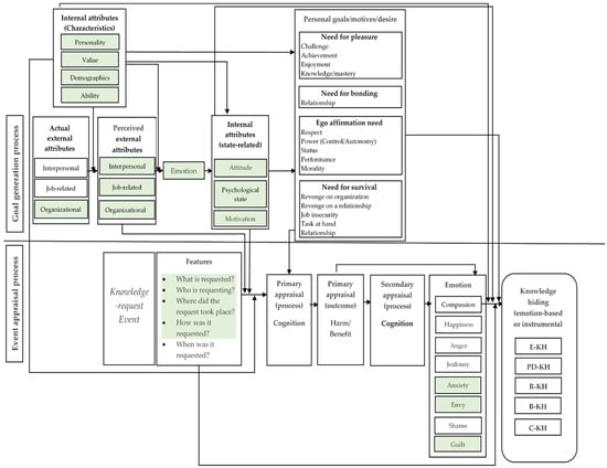 Moreover, we should also note that the various features of the knowledge request may ultimately lead to KH. A knowledge sharing request event includes five significant features based on who, what, when, where, and how questions. From these questions and the stable person–environment relationship (internal and external attributes), an employee evaluates whether the knowledge request is related to their personal goal and the goal is at stake or not. From the primary appraisal process, the employee can immediately decide whether sharing knowledge will be harmful or beneficial to the goal, which is a cognitive process.