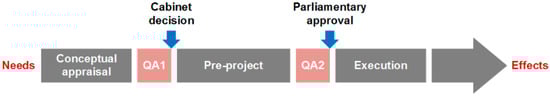 Today, major public projects performed by ministries or governmental enterprises that are expected to exceed an investment cost of USD 110 million are subject to external QA through the State Project Model, with the intention to ensure quality-at-entry prior to the final funding decision (Ministry of Finance 2019). The MoF has entered into framework agreements with private consultants who perform the external QA, but the final decision is a political one. The QA is an assessment of the projects’ decision documents comprising certain contents defined by the MoF, and independent analyses performed by the private consultants.