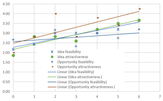 Measurements were taken at the beginning, before the course and after each completed topic to trace the changes in the students’ perception towards the studied phenomena. The short questionnaire measurement was used; it was designed with two blocks: (i) a block dedicated to the idea (feasibility, attractiveness) and (ii) a block dedicated to the opportunity (feasibility, attractiveness). After each topic of the course (see list of the topics in Table 1), the students were asked to register their perception of attractiveness and feasibility of their ideas and opportunities. The five-point Likert scale questionnaire was used: 1—not feasible/attractive; 2—the level of feasibility/attractiveness is low; 3—the level of feasibility/attractiveness is medium; 4—the level of feasibility/attractiveness is high; 5—absolutely feasible/attractive (see also Appendix B). Altogether, there were seven measurement points, one at the beginning of the course (before the first classes) and one after each of the six topics (following each class). As some students skipped some measurements, individual trajectories are presented based only on those who presented complete data. According to the initial estimate, the fluctuations of the other students’ measurements are similar to those presented in the next subsection. All estimates have been used to aid in the averages. Although the number of measurements is modest, this does not preclude a qualitative analysis and comparison of individual cases and development trajectories using pattern match theory (Trochim 1989).