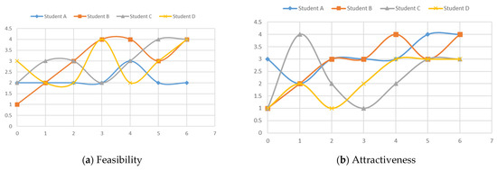 Dynamics of perception of idea (a) feasibility and (b) attractiveness by four students along the entrepreneurial journey on Likert scale 1–5 (min-max). Checkpoints 0–6 correspond to Table 1.