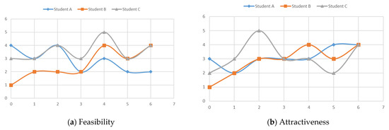 Dynamics of perception of opportunity (a) feasibility and (b) attractiveness by three students along the entrepreneurial journey on Likert scale 1–5 (min–max). Checkpoints 0–6 correspond to Table 1.