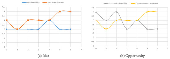 It can be observed here that changes in perception of the idea attractiveness pattern, describing the desirability–affective side of the idea, are not synchronous with feasibility pattern as the result of objective reality-fit perception. The perception of feasibility of a business idea and an idea’s attractiveness can change simultaneously either in a common direction or in opposite directions. It is also possible that one variable will change and another will remain the same. A similar phenomenon appears in the assessments of the entrepreneurial opportunity (Figure 4).