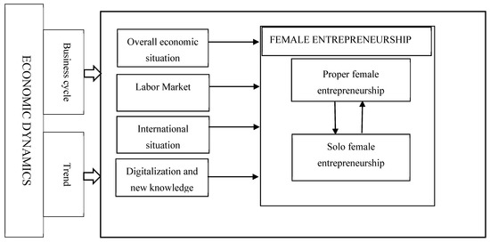 The gender gap in entrepreneurship has been observed for a long time, explained by both female-specific and gender-neutral factors, but none of these explanations is generally accepted. The aim of the paper is to assess the effect of internal economic dynamics on female entrepreneurship. Economic dynamics is a persistent process affected simultaneously by both endogenous and exogenous factors of a different time horizon, with the development trend and the business cycle as the most important time perspectives. The decomposition procedure of time series is implemented to extract trend and cyclical fluctuations, after which the Vector Error Correction Model (VECM) method is used to estimate models showing the impact of economic dynamics on female entrepreneurship in the long- and medium-run. The study concerns the countries of the Visegrad Group, including Czechia, Hungary, Poland, and Slovakia, and is based on quarterly data from the years 1998 to 2020. The results show that, although the economic dynamics impact female entrepreneurship, to some extent, it is not the most dominant factor. The impact of economic dynamics on female entrepreneurship is much stronger in the trend perspective than in the business cycle perspective. The nature of the effect of economic dynamics on female entrepreneurship is also country-specific.