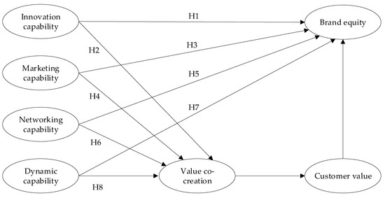 Dynamic capabilities comprise creative strategies that involve acquiring, allocating, integrating, reuniting, and forming alternative value for the firm (Kuo et al. 2017). This creative skill set is a driving mechanism for organizational performance (Lawson and Samson 2001) that helps firms predict market changes and explore niches. According to the literature, there has been a focus on the latest rules and mechanisms that facilitate the creation of distinctive and difficult-to-imitate advantages (Borch and Madsen 2007; Rezazadeh et al. 2016). The acquisition of dynamic capabilities can advance company practices, routines, or industry presence and improve firm relationships with customers, which can result in improved brand equity as well (Brodie et al. 2017). Thus, the seventh hypothesis is proposed as follows.