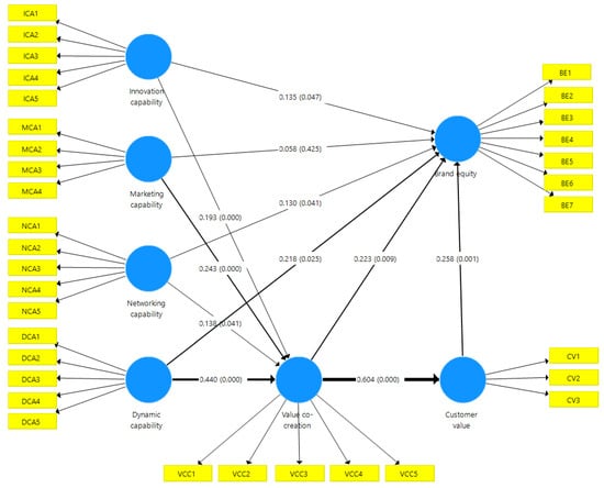 After analyzing the measurement model, the hypothesized structural relationships from various firm competencies, such as the ability to change innovation, marketability, networking, and dynamic capabilities, to brand equity were tested by estimating the structural model (Figure 2). We analyzed the structural model by using 4999 sample bootstrapping to get p-values for significant values (Caldeira and Kastenholz 2018). In terms of direct effects, the estimation result indicated that hypotheses H1, H5, and H7 have p-values of 0.05, equal to a 5% significance threshold, as shown in Table 6 and Table 7, and Figure 2. Thus, all firm competencies except marketing capability had significantly positive relationships to brand equity (p-value < 0.05).