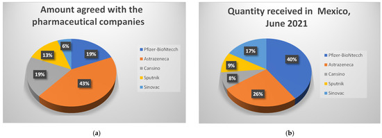 Vaccine availability in México in 2021, (a) Amount agreed with the pharmaceutical companies and (b) Quantity received in Mexico, June 2021 (Leyva 2021; Expansión Política 2021).