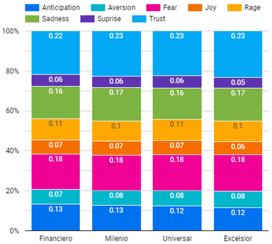 After data screening on the websites, the study conducted a sentiment analysis (Methodology for Designing Humanitarian Supply Chains Distribution of COVID-19 Vaccines in Mexico 2021). The articles were translated into the English language to take advantage of the existing dictionaries that utilize artificial intelligence to classify the emotions contained within a string of text, such as anticipation, aversion, fear, joy, sadness, surprise, and trust. The results show a similar percentage across the newspapers (Figure 3).