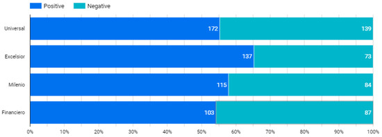 The study classified the predominating opinions within articles into negative and positive and plotted a graph for each news site to assess the overall distribution of opinions. As presented in Figure 4, more than 50% of the articles conveyed a positive tone. The news site with the greatest number of articles with positive opinions is Excelsior, a leftist newspaper. Nevertheless, when analyzing the predominating emotions and categorizing them into negative (sadness, aversion, rage, and fear), positive (joy and trust), and neutral (surprise and anticipation) emotions, the study found that negative emotions across all newspapers surpass the frequencies of positive and neutral emotions, as depicted by the bar graphs in Figure 5.
