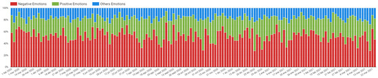 Lastly, using this categorization, the study analyzed trends according to the publication dates of the articles (Figure 6). Negative emotions continued to dominate the timeline of published articles. However, the frequency of negative emotions seemed to decline by the end of March, which coincides with the start of the application of vaccines to the population over than 60 years. Thus, the study proposes that media opinions should be investigated throughout the remainder of the vaccination strategy as a future effort.