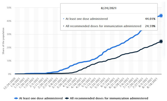 On 25 August 2021, 82,678,717 doses of the COVID-19 vaccine had been applied in Mexico, according to the data presented by the Ministry of Health. With these doses, 56,925,095 have been vaccinated, of which 32,278,249 (56.70%) have completed the vaccination scheme and 24,646,846 have received one dose (Ramos and Contreras 2021). However, these data vary depending on the source. According to Statista (2021b) in Figure 7, only 44.01% have been vaccinated with a single dose and only 24% have received the recommended dose.