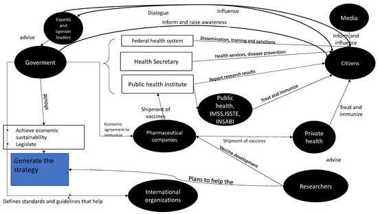 The Ministry of Health in Mexico is a branch of the Executive Power, which is mainly in charge of disease prevention and health promotion for the population (Gobierno de México 2019b). The Ministry of Health established a healthcare strategy that promotes community actions that are linked and integrated with the first level of attention. The first level of attention comprises (1) promotion campaigns for community healthcare, (2) specialized brigades, and (3) clinical attention equipment units, which are coordinated among one another. However, they have not provided the expected results because Mexico is one of the highest-ranked countries in terms of mortality. A document (Secretaría de Salud 2020) that exposes this strategy mentions that actions should be organized and coordinated from the Healthcare Unit at the first level, or by those that operate in corresponding territories. In other words, these units are operating at the local level and communicate to the federal level after this. However, even the task of providing timely follow-up to patients presents a problem in this case. The massive numbers of local brigades are those tasked with providing information on which actions are being taken to the first-level unit. However, this process lacks a real-time information system. As such, this system lacks effectivity at the metropolis level, where an increase in COVID-related cases and deaths is observed. The rate of disease transmission has led to a loss of control according to this strategy. Moreover, this document does not mention the participation of stakeholders in immunization strategies, but only highlights the patient follow-up.