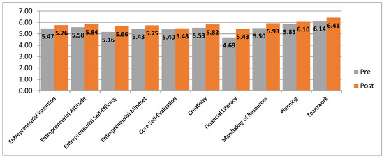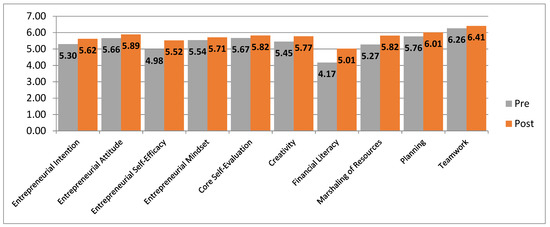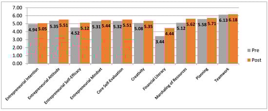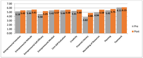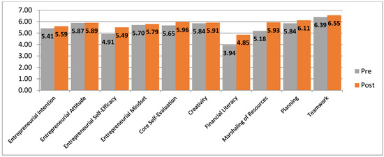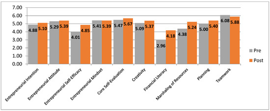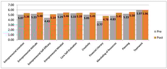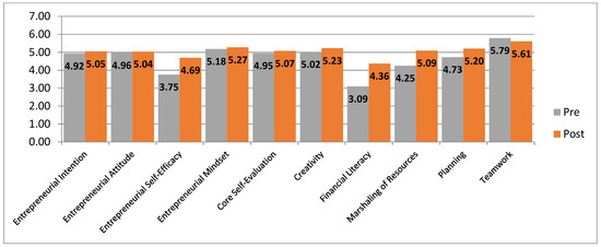 The next analyzed category is the entrepreneurial background of the students. The students were divided into two groups: (1) students who had already taken part in practice-oriented entrepreneurship programs (Figure 6); (2) students without any experience of practice-oriented entrepreneurship programs (Figure 7). As we can see from Figure 6 and Figure 7, there are differences between the two categories. In general, there is an increase from the pre to the post values, except for teamwork (−0.20) and entrepreneurial mindset (−0.02) for those who participated in such a program for the first time. Looking at Figure 6 and Figure 7, it seems that the program was more effective for those who had already participated in other entrepreneurial programs, with respect to the entrepreneurial mindset and teamwork variables. As far as entrepreneurial self-efficacy, financial literacy and marshaling of resources are concerned, there is a clear increase in favor of those who had never participated in entrepreneurial programs. Such a marked increase might suggest that these kinds of entrepreneurial programs may be more effective for those students with fewer entrepreneurial skills and abilities.