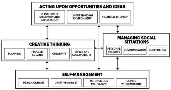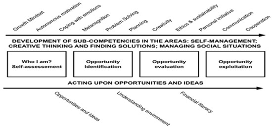Based on the specifics of entrepreneurship, the entrepreneurship process can only take place if the individual participates in the process. This specificity determines the areas of the competence model that describe the sub-competencies that support individuals’ enterprising attitudes and behaviour and that are necessary for the successful discovery and exploitation of opportunities. So, to develop specialist sub-competencies (i.e., professional skills) in entrepreneurship, competencies such as creativity, social skills and problem-solving skills are required to facilitate the development and coping abilities of individuals in the labour market and of citizens in society (European Commission 2006; Arevalo et al. 2010; Virtanen and Tynjälä 2019).