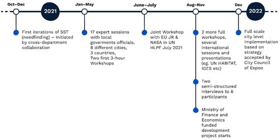 Tool development started with the first prototype during the autumn and winter of 2020 (Figure 1). Altogether, 17 different expert sessions and two full workshops were held during the spring of 2021. During the following summer, the SST was introduced in the UN HLPF (High-Level Political Forum) meeting, in the same workshop with the EU JRC (European Union Joint Research Centre) and NASA (National Aeronautics and Space Administration). Work continued into autumn 2021, with more workshops and interviews, including several international sessions, being held. As a result of this cumulative process, the SST is now being developed by a consortium of the six largest cities in Finland.