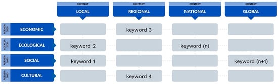 The third step is divided into two tasks (a and b). Steps 1 and 2 select the main and supporting SDGs, reveal the holistic nature of sustainable development, and explore the phenomenon’s operational environment. In task 3a, the results of steps 1 and 2 are combined in a matrix (Figure 3). The analysis is deepened by adding key words describing the phenomenon in the matrix. That is, the ranked dimensions are specified with a qualitative element. The key words can include, for example, the main projects, goals, or actions taken. They should be very concrete and descriptive to deepen understandings and explicate the decisions made in previous steps.