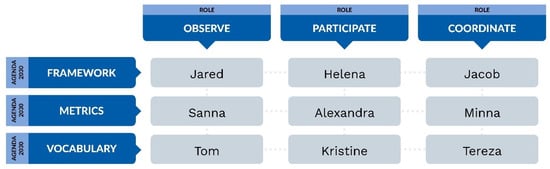 Step 6 (one task) explicates social networks, different roles and an understanding of your own role in different dimensions of the UN Agenda (framework, metrics, vocabulary). Beyond that, all relevant stakeholders are added to the matrix (see Figure 4). Their roles and functions are classified as: