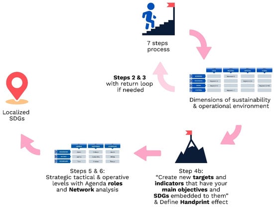 After defining the main and supporting SDGs, the sustainability dimensions and operative environment are Analysed. In Step 4 (b), new Localised indicators are created, while steps 5 and 6 are about identifying and defining dimensions of strategy, roles and the network.