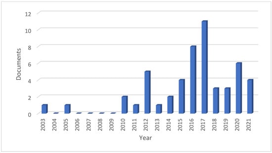 We screened 52 scientific articles published from 2001. Among these articles, 52% are based on a quantitative method, while 38% on a qualitative method and 10% on a mixed one. The trend of publications seems irregular. For the years between 2001 and 2009, we selected a research article only for 2003 and 2005, while the number of selected published documents from 2010 to 2021 is characterized by constant increases and decreases in publications. Lastly, 2017 is the most relevant year in terms of publications (11 documents) (Figure 1).
