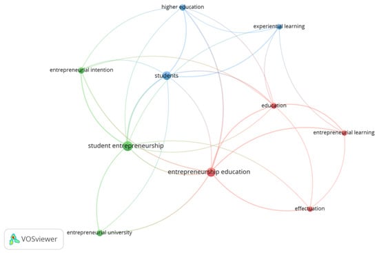 Additionally, we pointed out the cluster analysis through the occurrence, selecting 4 as the minimum number of occurrences of a keyword. Then, we deleted two words already used. Figure 2 highlights the following three research areas: (i) student entrepreneurship and entrepreneurial intention; (ii) university support for entrepreneurship; (iii) entrepreneurship education and learning.