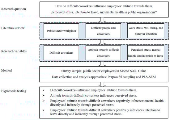 () indicated that troublesome others (i.e., difficult coworkers including superiors, peers, and subordinates) tend to exhibit a wide range of distasteful interpersonal behaviors including being a busybody, lording power, unprofessional behavior, and even sexual harassment, and poor work-related behaviors including bossiness and incompetence. () provided empirical evidence that difficult workers are multidimensional in nature. Using () and () approaches, this study explores employees’ perceptions of difficult coworkers in Macao’s public organizations. The study aims to answer the following research question: How do difficult coworkers influence employees’ attitudes towards them, job stress, intention to leave, and mental health in public organizations? The study is grounded in the stimulus–organism–response theory (; ). In the study, the external factor that characterizes employees’ perceptions of the degree of unease and frustration in the presence of difficult coworkers and interacting with them (i.e., attitude towards difficult coworkers) is considered as a stimulus that affects employees’ internal emotional conditions—the organism (i.e., perceived stress). The organism leads to responses such as employees’ feelings towards leaving the organizations (i.e., intention to leave) and mental health. The findings of the study contribute to the identification of difficult coworkers as a critical organizational issue in the public sector and how difficult coworkers impact employees’ job environments. The remainder of the paper is structured as follows. Section 2 reviews the literature on workplace environment in public sectors and the effects of difficult coworkers on employees’ responses and presents the associated hypotheses. Section 3 presents the sample of the study, measurement scales, and data collection and analysis approaches. Section 4 presents the study’s findings. Finally, Section 5 and Section 6 discuss and conclude the study. The research framework is shown in Figure 1.