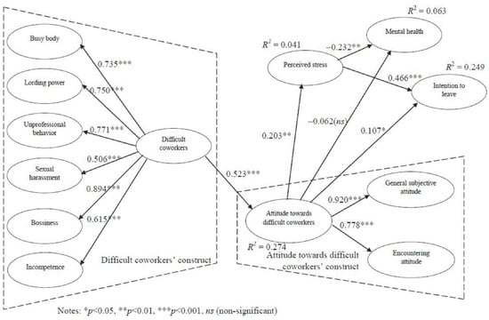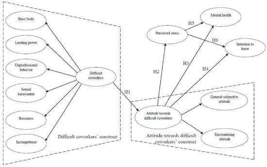 Figure 2 shows that difficult workers and employees’ attitudes towards difficult coworkers are two second-order constructs. Specifically, difficult coworkers influence employees’ attitudes towards them, while attitudes towards difficult co-workers affect employees’ mental health and intention to leave directly and indirectly through employees’ perceived stress. Hypotheses H1–H6 are presented in this figure.