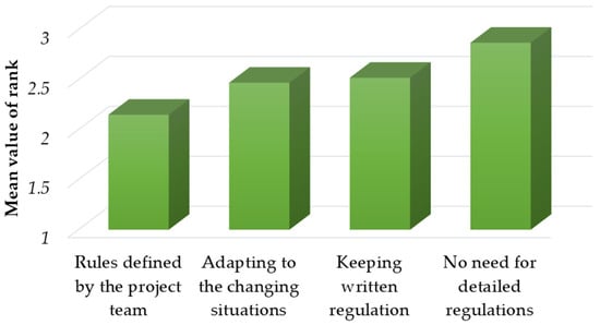 Although the predictability of product development is low, and changes are common, the students considered the rules and regulations as necessary. Based on the ranking of the related questions, only a fifth of them ranked in first place that the project will be completed the fastest, and there is no need to complicate it since everyone performs the tasks to the best of their knowledge. At the same time, the students believed that the rules must have been defined by the project team taking the specificities of the given project into account. Opinions on keeping the written regulations were divided. The mean values of the rank orders are presented in Figure 1, and the distributions of the rankings are detailed in Table 5.
