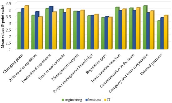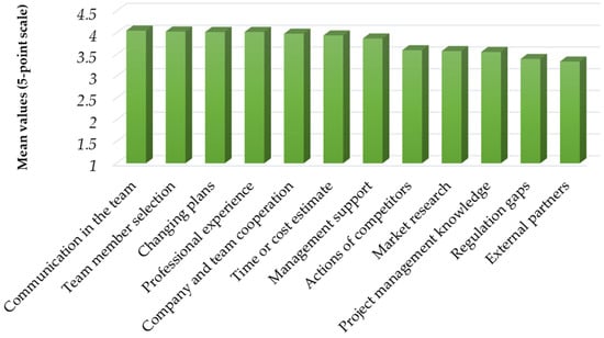 Improper communication solutions between team members were the most important contributors to product development project failure based on the mean values of the students’ evaluations (Figure 2). It is followed by selecting the team members, changes in the project plan, and the lack of experience in similar development challenges. According to the grouping of the factors investigated, external issues and the lack of regulation were at the end of the list. The descriptive statistics of the results and the correlations are placed in Appendix A.