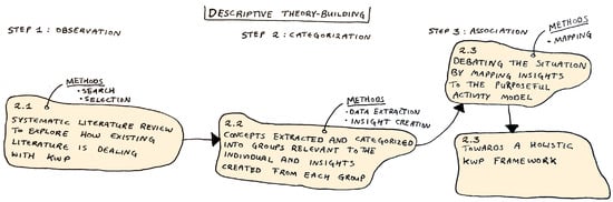 In the observation step of descriptive theory building, this research utilizes a systematic literature review to explore how the existing literature deals with KWP (see Section 2.1). In the categorization step, concepts are extracted and categorized into groups relevant to the individual and insights created from each group (see Section 2.2). To aid in the association step of descriptive theory building, the third activity in SSM is executed: debating the situation (see Section 2.3).