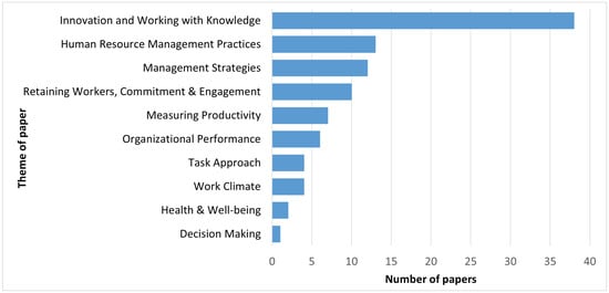 Around 40% of the papers, in total 38 papers, had the main theme innovation and working with knowledge. Older papers were more focused on knowledge management and information communication technology (ICT), while newer papers shifted their focus more to personal knowledge management and innovation performance. Even though human resource management practices was the second most popular theme, only 13 papers discussed this theme. These papers detailed, for example, studies on what human resource management practices were being used in some specific context, how specific strategies affect performance or how different strategies work with different job characteristics or in different work climates. The third and fourth most popular themes were management strategies and retaining workers, commitment and engagement, with 12 and 10 papers focusing on these themes, respectively. Other themes, which fewer than ten papers address, are measuring productivity, organizational performance, task approach, work climate, health and well-being and decision making.