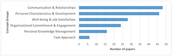 Seventy-eight of the ninety-seven papers in the literature review touched on concepts grouped into the six concept groups directly relevant to individuals and their work: organizational commitment and engagement, communication and relationships, personal characteristics and development, personal knowledge management, well-being and job satisfaction and task approach. Table 2 shows these groups and some examples of concepts from the papers in each group. The list of concepts in Table 2 is not exhaustive but does give an idea of how the groups were formed.