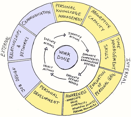 Óskarsdóttir et al. (2021) explored the problem situation of managing and improving KWP by executing the second activity in the soft systems methodology (SSM). They formulated a purposeful activity model (PAM) of the system for the individual KW defined in the first activity in SSM, analyzing the problem situation, which was performed in Óskarsdóttir and Oddsson (2017). The PAM proposed by Óskarsdóttir et al. (2021, p. 4) describes the activities that the individual knowledge worker (KW) engages in when using “resources to execute actions to create tangible or intangible artifacts with the intention of generating value”. These are the activities needed for the system to achieve its purpose of generating value for the individual himself/herself, the organization he/she works for and the community at large.