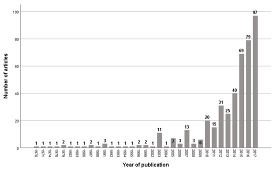 Data, in Figure 1, show an increase in the annual number of published papers on social innovation, mainly over the last decade (representing 89.6% of all publications). It is also important to mention that more than half of the papers (245) have been published in the last three years. Since 2014, the number of publications has been equal to or greater than 40 papers per year. The largest number of publications was reached in 2017, with 97 papers published. The rise in the number of publications and research interests in the area of social innovation can be explained by a number of factors, including the attention that USA and European countries are giving to the topic, demonstrated by the generous funds for social innovation (Howaldt and Schwarz 2010). The recent financial and economic crisis refines creativity and social innovation, promoting sustainable growth, avoiding job destruction, and increasing competitiveness (Pelka and Terstriep 2016).