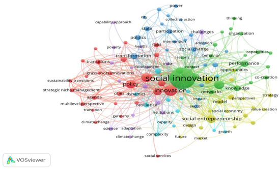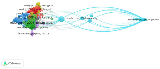 Based on 444 papers, a co-citations analysis was performed to construct the respective network (Figure 2 is grouped into seven clusters, which correspond to processes related to social innovation research, namely: cluster 1—methodological and conceptual proposals for future research in the field of social innovation; cluster 2—the concept of social innovation and impact of governance; cluster 3—strategic management and social innovation; cluster 4—social innovation and entrepreneurship; cluster 5—the role of social innovation for local development; cluster 6—social innovation and creativity; and cluster 7—transformation in ecosystem management through social innovation.)