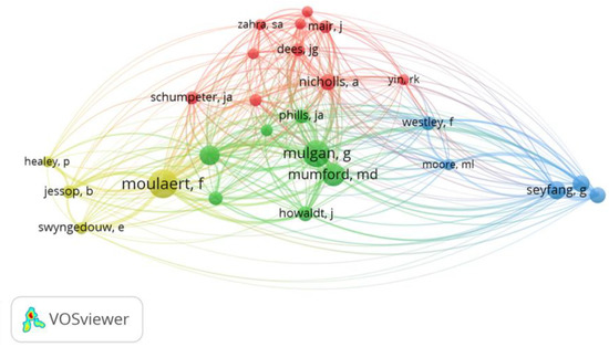 After analyzing the 444 papers, Figure 4 presents the authors with the highest number of co-citations (30 or more); Moulaert is the most co-cited author, with a total of 214 citations. Most of Moulaert’s research work focuses on the study of urban development and the institutional dynamics of social innovation and social exclusion.