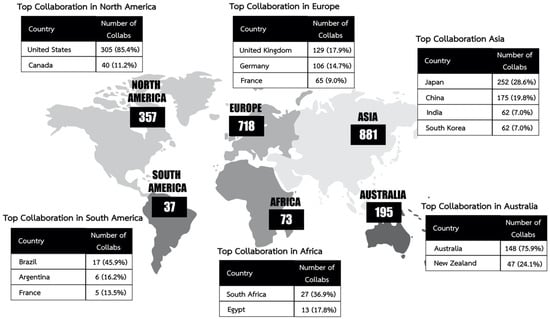 To better understand the trend of international cooperation in science and technology research of researchers at Chiang Mai University, Table 3 depicts the co-authoring patterns of different countries. The data are sorted by the largest number of authors in each country from the total number of publications and was classified as paper with two authors, multiple authors, and Mega authors. Comparative results by country show that the United States, Japan, China, Australia, United Kingdom, Germany, France, India, South Korea, and Italy were among the top ranks in collaboration with CMU researchers. About 60% of all papers in the dataset come from the presented countries through the collaboration of two and more than two authors. The cross-country collaboration is depicted in Figure 1. The collaboration network shows that most countries collaborated partner is with countries such as the United States, Japan, and China. Figure 1 shows the results of international collaboration by continent that cooperates with CMU researchers in science and technology; it exhibits that Asian countries have the most cooperation with CMU researchers accounting for 39%, European countries accounting for 32%, and North America, 16%, respectively.