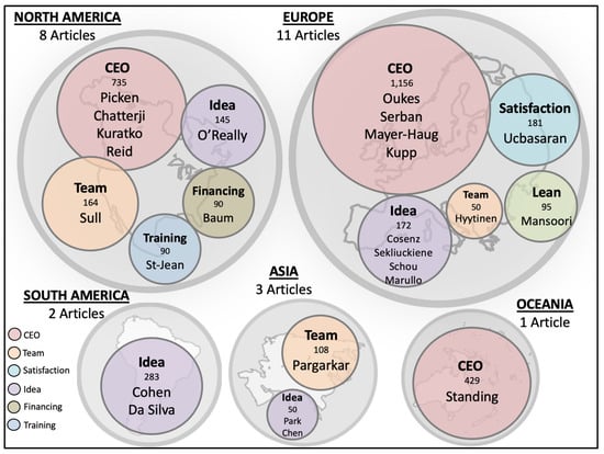 In the third stage, the location (by continent) is the categorical variable that serves to define the groups of factors to be compared. This analysis technique has been used for bibliometric analysis of relevant domains related to entrepreneurial universities (), and also in the scientometric analysis of entrepreneurship in small businesses and innovation (). It has also allowed a better understanding of the research structures of entrepreneurship through co-word (). However, it has not been applied to the specific analysis for the mapping of success factors of start-ups in the entrepreneurship ecosystem.
