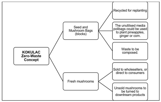 The KOKULAC operational system is based on the zero-waste concept (see Figure 3). The commitment to recycling waste was evident as early as when the blocks were prepared. Their forward-thinking mindset helped in the design of blocks that can be reused after the growing season ends or when they can no longer be used to grow mushrooms. The compost will be processed for other crops. With the advice from the Malaysian Nuclear Agency (ANM), three types of plants were identified as the most appropriate, which were pineapples from the MD2 variant, ginger, and corns. Similarly, the unused waste could be repacked, added to the booster, and sold to villagers to grow their crops. Furthermore, to tackle the issue of unsold fresh mushrooms, the community, growers, and members have received training on downstream products. The products include mushroom burgers, pickled mushrooms, mushroom seasoning powder, mushroom soup, and fried rice paste.