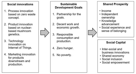 Next, the findings also suggest that KOKULAC’s social innovation approaches have helped to improve social capital, which consists of four domains. The first domain is inter-social and business innovations. KOKULAC has introduced innovations that are beyond mushroom and genetic development, which is assisted by the Nuclear Agency. Their partnership and networking has allowed them to develop innovative solutions for zero-waste items and think about product diversification across groups and stakeholders. Next is the sharing economy, which is the sharing of resources. It benefits not only KOKULAC as an organization, but its values are spread across the chain of stakeholders—members, community, growers, distributors, and suppliers. The third domain is social inclusion. This is the provision of greater social ownership, especially for participating women and housewives. Their involvement allows for greater access to the right to own, right to work, and right to be healthy. Finally, there is social empowerment. With the ability to improve on income and financial ownership, the participants feel a greater self-autonomy and confidence, which is extremely fundamental in the development well-being. The key to social empowerment is to act collectively within the business ecosystem, but with the freedom to decide on financial independence. The four components of social capital are parts of the various social innovation values that have been characterized in past research including the work of Grilo and Moreira (2022). Based on the findings and discussion, the following model for social innovation and sustainable development is proposed(see Figure 4).