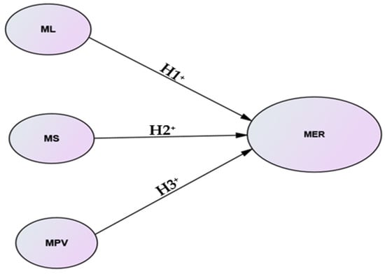 In Table 2, it is possible to see a summary of the hypotheses that were tested, using what was found to be the best research model, as well as the results that were obtained, which allow one to conclude that such dimensions account for the variation that occurs in MER as ML (β = 0.900, p < 0.001) and MS (β = 0.080, p < 0.05), and MPV (β = 0.030, p > 0.05). Only two of three dimensions were statistically significant in the final structural estimated model (Figure 2). The structural results point to ML and MS dimensions having a direct, positive, and statistically significant influence on MER, validating research hypotheses H1 and H2. Conversely, the MPV dimension has a direct positive but not statistically significant influence on NIR, not validating research Hypothesis 3.